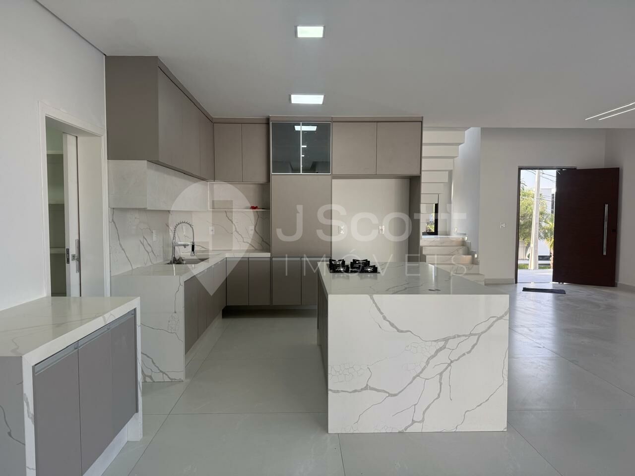 * Cozinha ampla com ilha em porcelanato Calacata, integrada à despensa